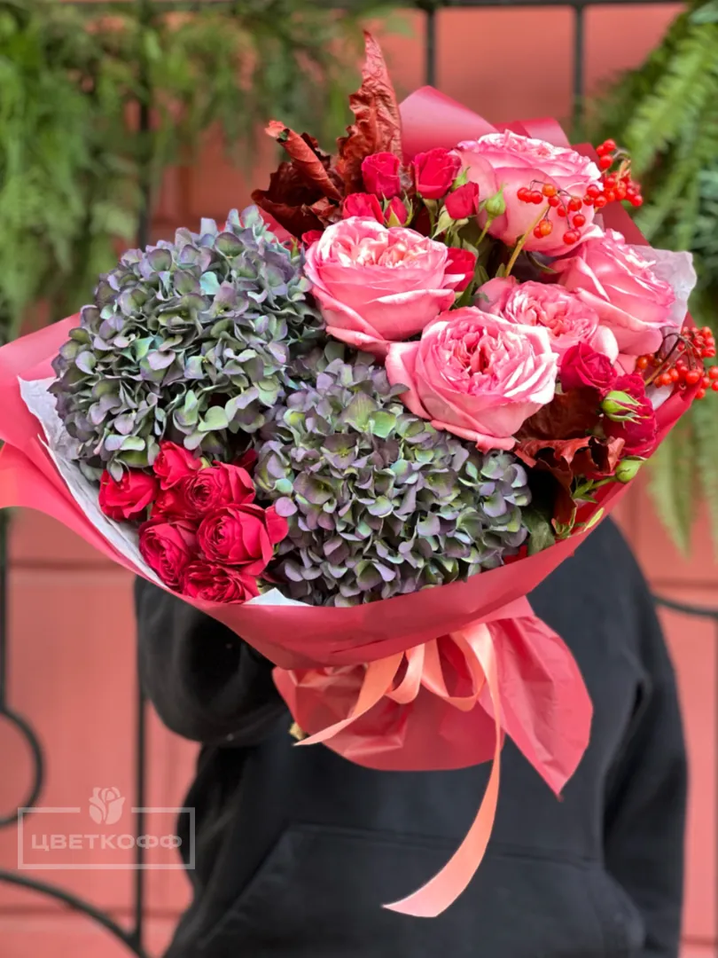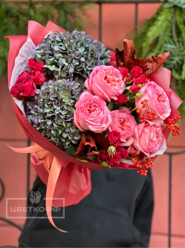 Сборный букет с сухоцветной гортензией и ягодами