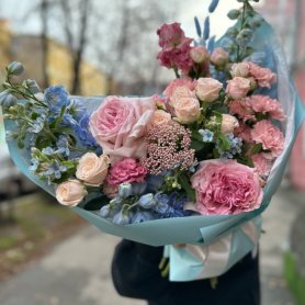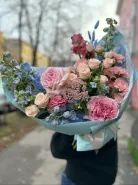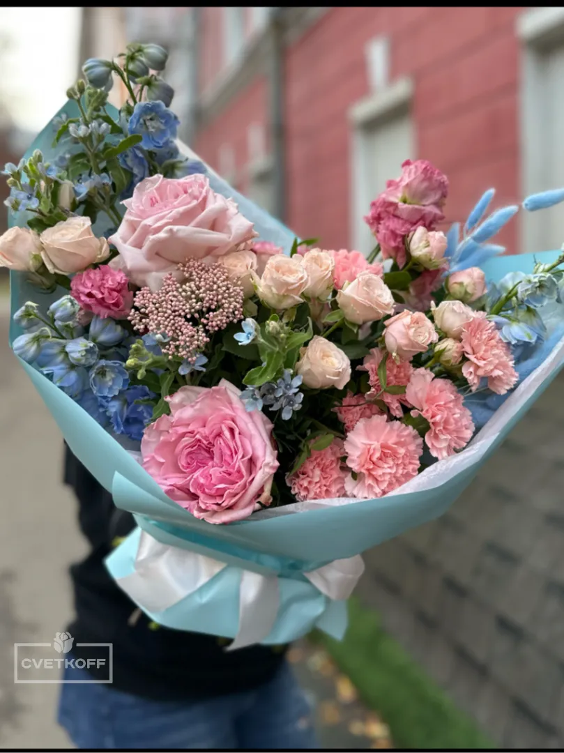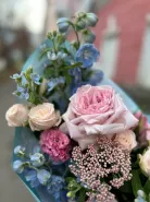 Мы знаем, как вы любите нежные и изысканные букеты, и именно поэтому решили добавить немного романтики в яркую осеннюю палитру. Получился очаровательный дуэт из ароматной пионовидной розы Pink o’hara и голубых цветов — лёгкий, воздушный и невероятно милый!