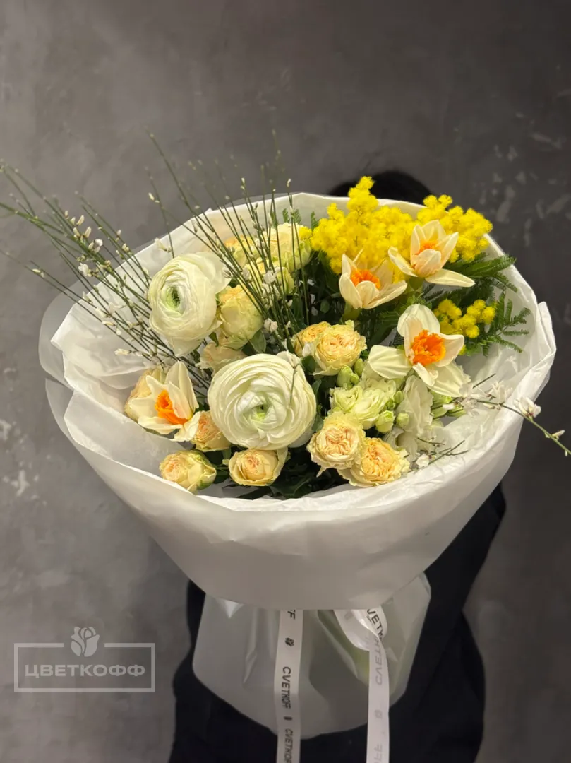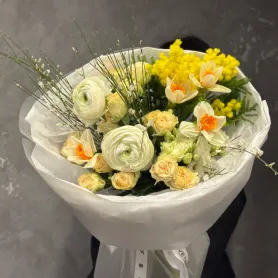 Этот букет нежная композиция из белых ранункулюсов, желтых нарциссов и вкраплений золотистой мимозы, создающая легкую и воздушную атмосферу. Сочетание свежих цветов в окружении изящной зелени оживляет пространство, наполняя его весенним настроением. Букет станет прекрасным подарком для тех, кто ценит элегантность и природную красоту.