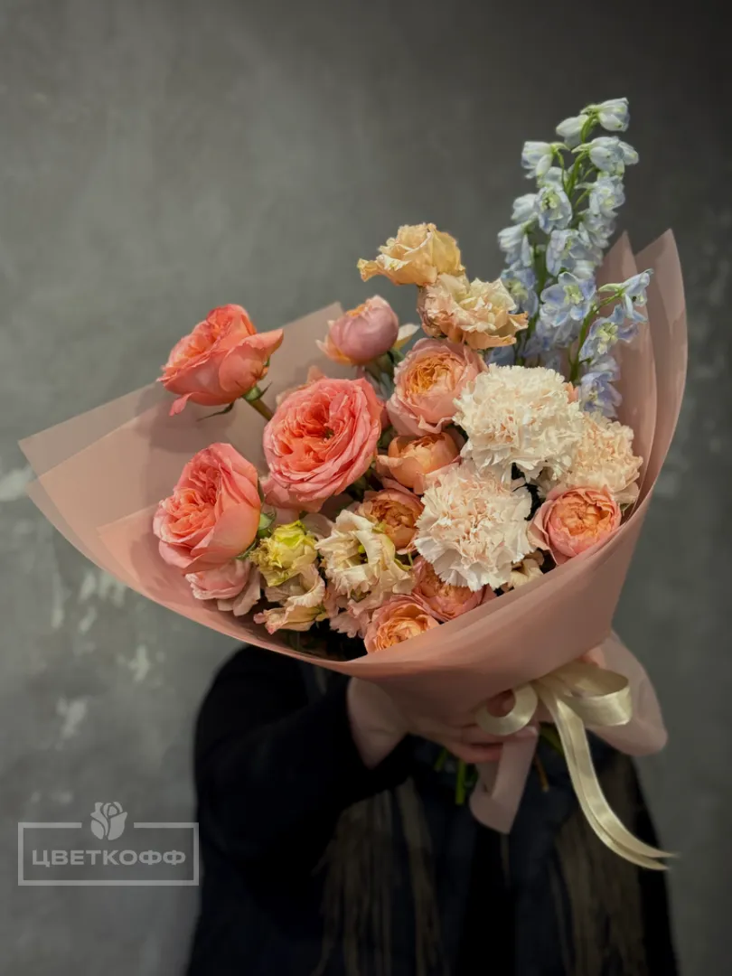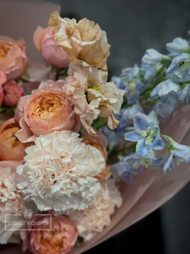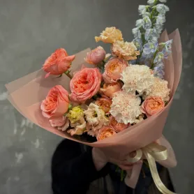 Букет, выполненный в нежных тонах, представляет собой гармоничное сочетание розовых роз, белых гвоздик и голубых дельфиниумов. Необычная цветовая гамма и оригинальная композиция делают его изысканным и стильным подарком. Этот букет прекрасно подойдёт для любого торжественного случая.