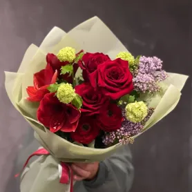 Этот сборный букет с амариллисом и сиренью станет прекрасным украшением любого интерьера. В состав входит изящная сирень, которая добавляет нежности и уюта, и яркий амариллис, придающий композиции выразительности. Цветы тщательно подобраны и собраны в красивую композицию, которая подчеркнет ваш особый день или создаст уютную атмосферу дома. Букет выполнен из свежих и качественных материалов, что гарантирует длительный свежий вид. Идеально подходит в подарок или для украшения любого помещения. Компактный и элегантный, он легко впишется в любой стиль оформления. Такой букет станет прекрасным выражением нежных чувств и хорошего вкуса.