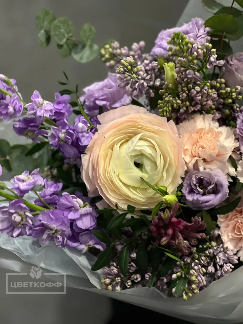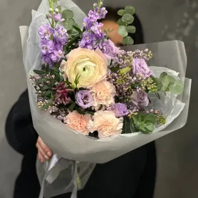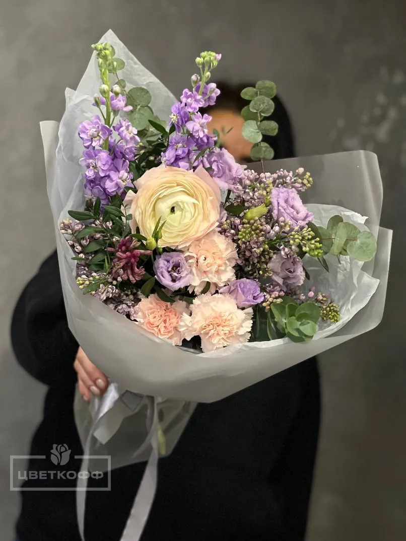Этот букет — воплощение нежной весенней симфонии, где каждый цветок рассказывает свою историю. В центре композиции величественно расположился ранункулюс, словно утренний рассвет, пробуждающий природу. Фиолетовые акценты маттиолы и эустомы создают лёгкую загадочность и глубину, а веточки сирени наполняют композицию ароматом пробуждающейся природы.