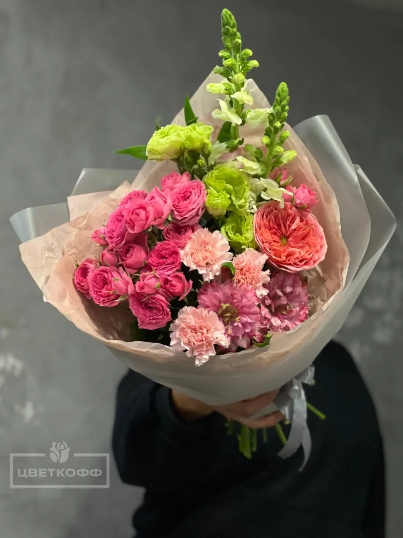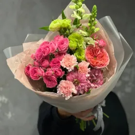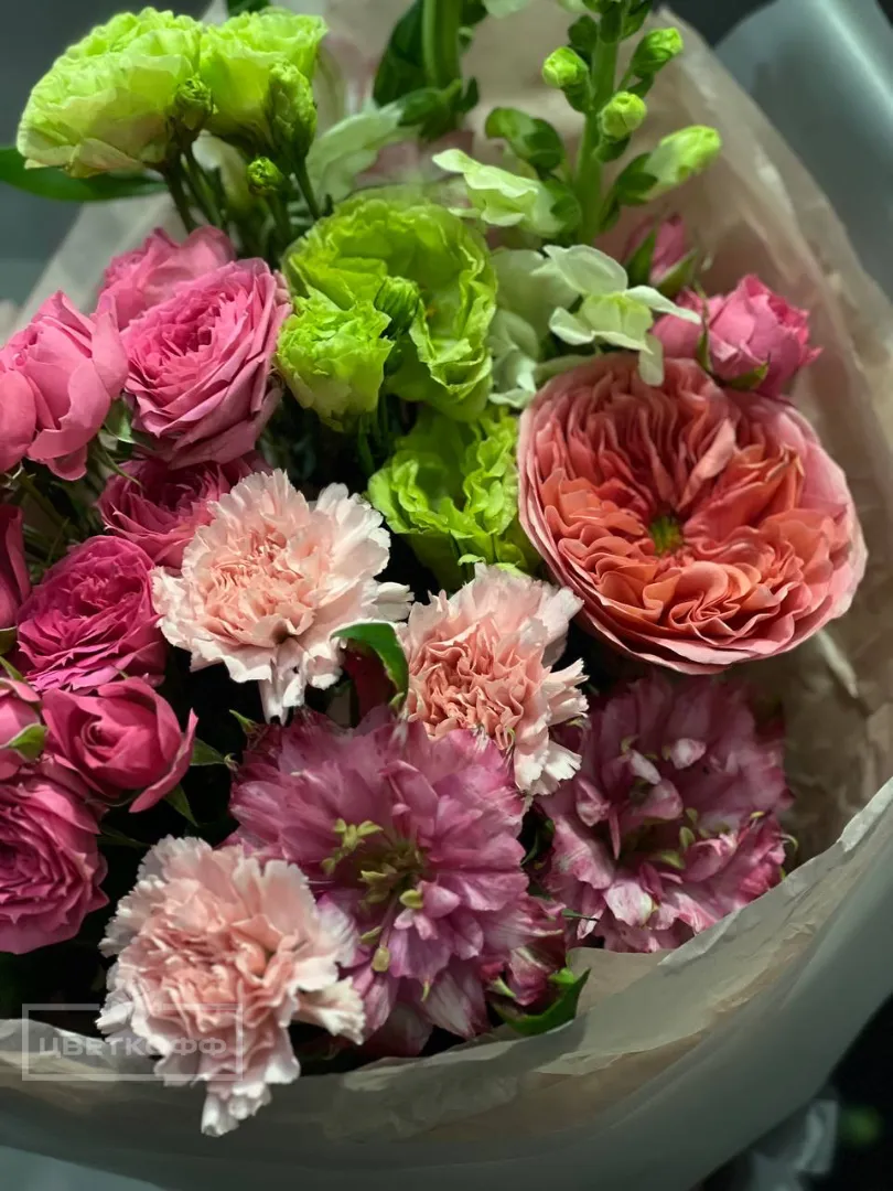 Когда хочется сказать о своих чувствах без слов — подарите этот букет. Розовые оттенки пионовидных роз и диантусов передают теплоту и заботу, а зелёные акценты добавляют свежести и живости. Пусть этот букет принесёт радость и улыбки! 😊