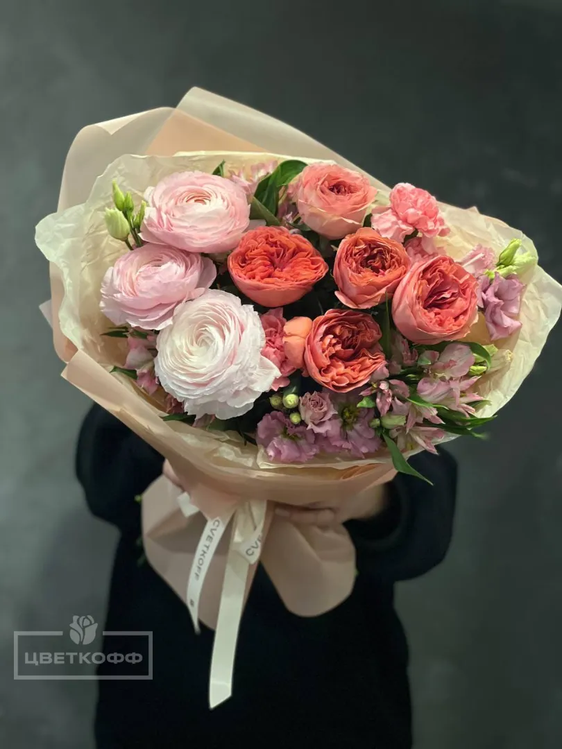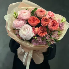 Этот изысканный букет — воплощение нежности и утончённости. Пионовидные розы коралловых и нежно-розовых оттенков сплетаются в гармоничную композицию, дополненную изящными бутонами и сочной зеленью. Лёгкая упаковка пастельных тонов подчёркивает романтичность букета. Идеальный выбор для тех, кто ценит истинную красоту и хочет подарить частичку тепла.