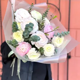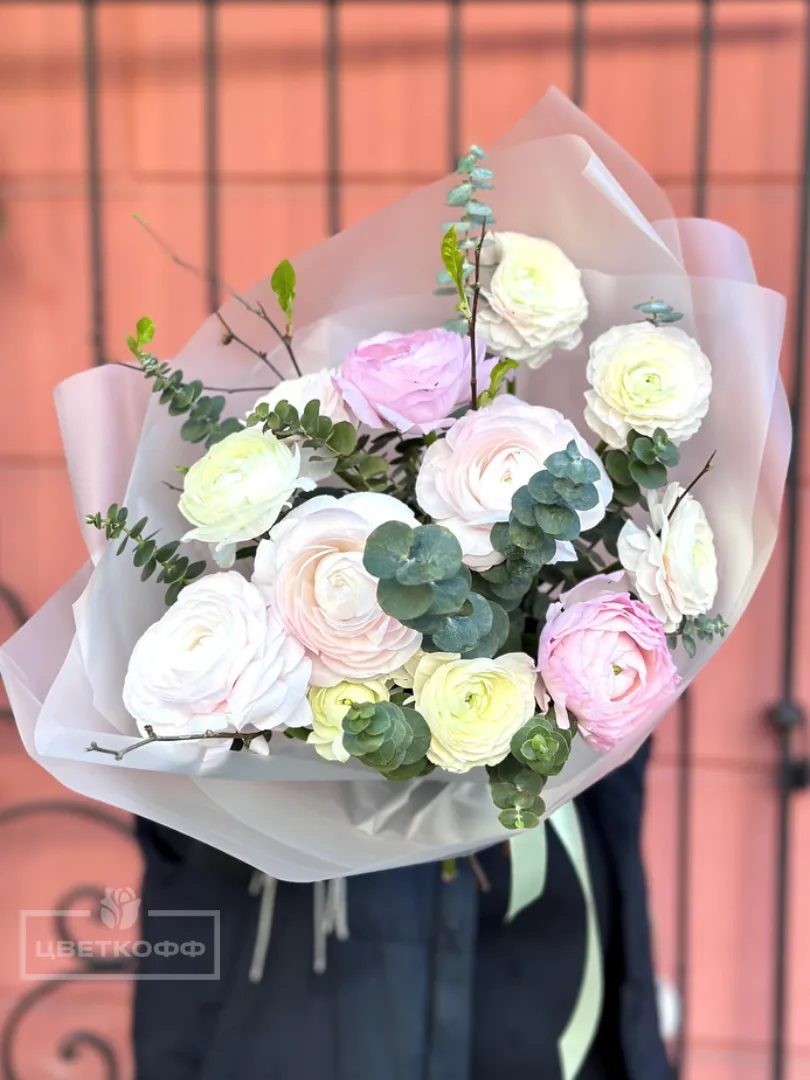 Представляем вам элегантный моно-букет, подчеркивающий изысканную красоту ранункулюсов. Нежные, словно лепестки розы, ранункулюсы обладают уникальной многослойностью и богатством оттенков. Их бархатистая текстура и утонченные формы создают ощущение роскоши и нежности. Серебристо-зеленая зелень эвкалипта добавляет букету современности и свежести, прекрасно контрастируя с мягкими цветами. Этот букет станет идеальным подарком, выражающим внимание и тонкий вкус. Добавьте нотку природной элегантности в любое событие с этим чарующим композицией.