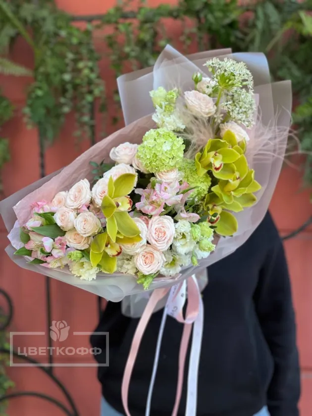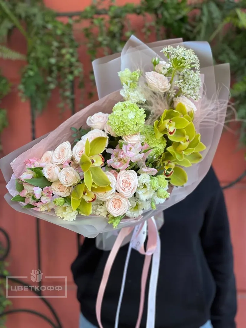 Сборный нежный букет с зеленой орхидеей