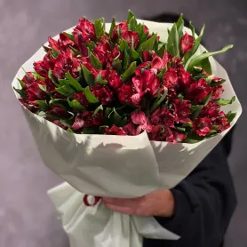 Этот монобукет из 19 алых альстромерий – воплощение страсти и элегантности. Яркие, крупные бутоны, словно драгоценные камни, собраны в единую композицию, излучающую тепло и энергию. Каждый цветок альстромерии, с его изящными лепестками и нежным узором, придает букету утонченность и глубину. Красный цвет символизирует огонь чувств, преданность и восхищение, делая этот букет идеальным подарком для выражения самых сильных эмоций. Этот сдержанный, но эффектный букет станет незабываемым акцентом любого торжества или особенного момента.