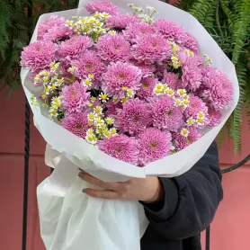 Элегантный монобукет из сортовых кустовых хризантем станет прекрасным украшением любого интерьера. В его составе собраны изящные цветы Матрикария и кустовые хризантемы, создавая гармоничный и привлекательный букет. Цветы отличаются свежестью и насыщенностью красок, что подчеркнет ваш вкус и статус. Такой букет отлично подойдет в качестве подарка или для украдения собственного пространства.