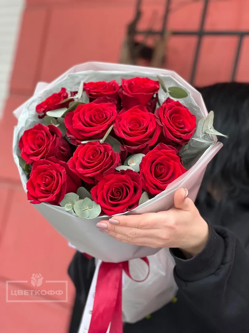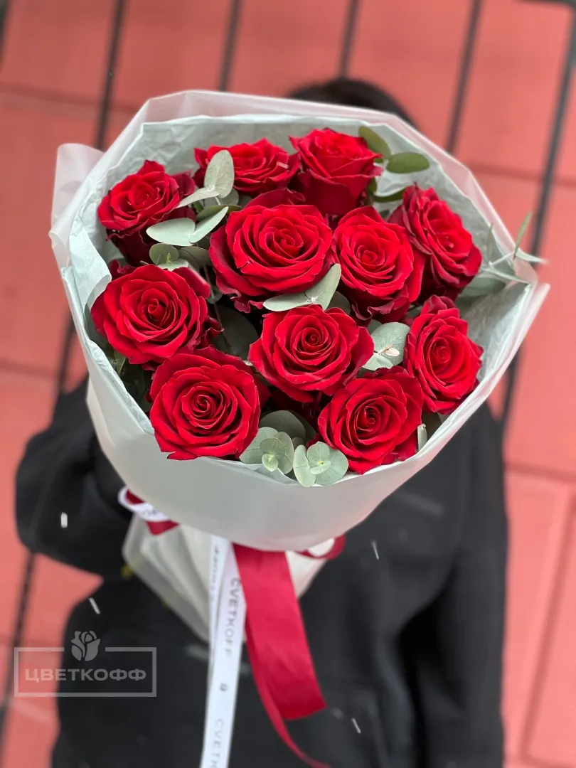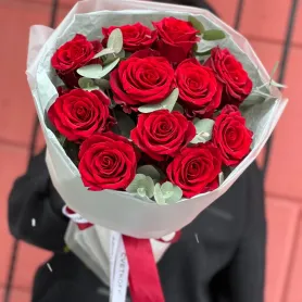 11 красных роз с эвкалиптом