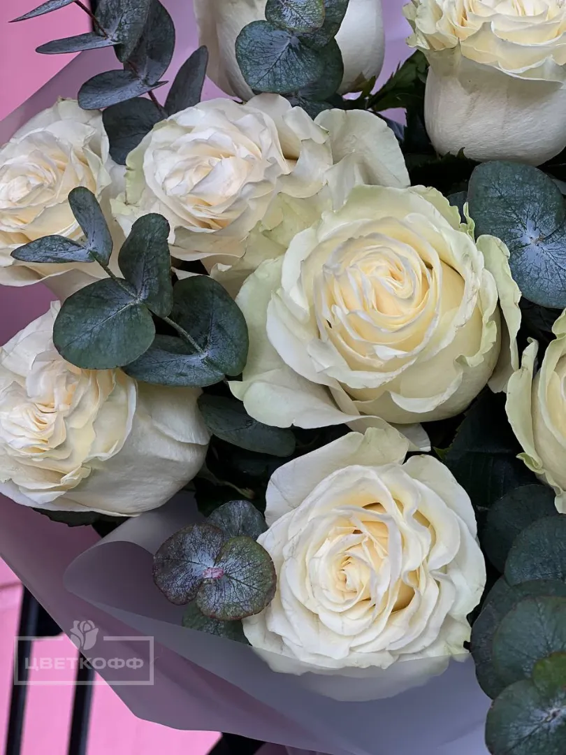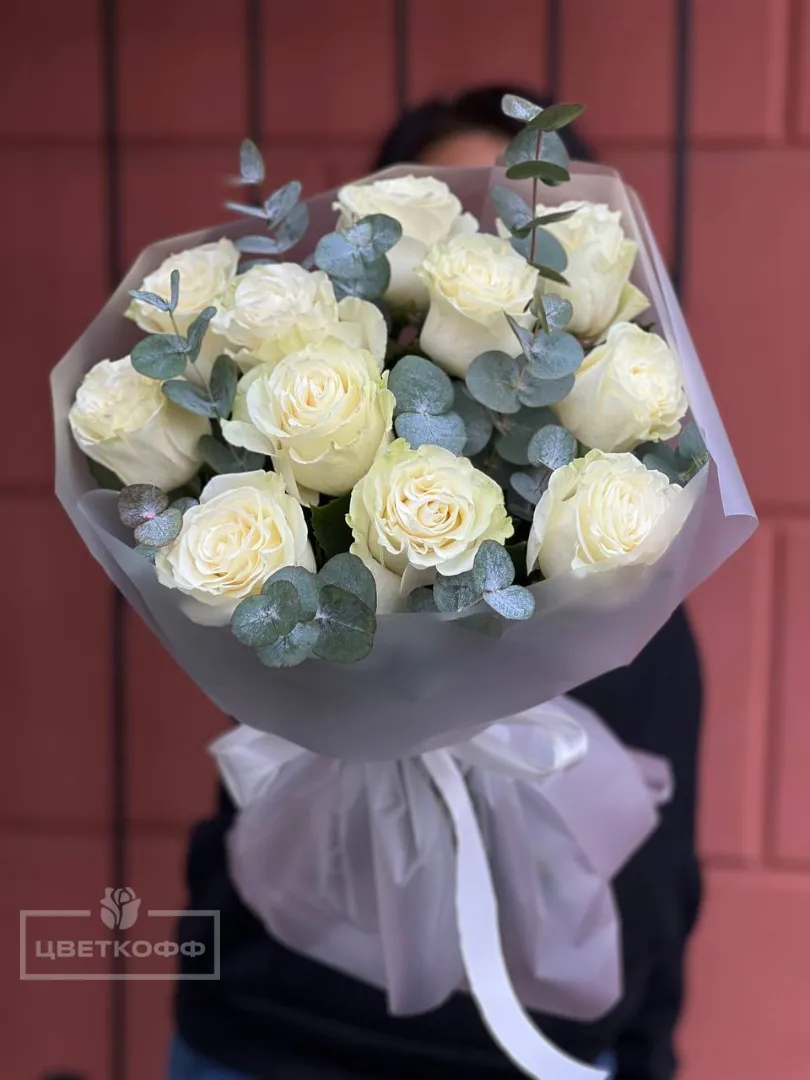 Моно букет из 11 белых роз с эвкалиптом
