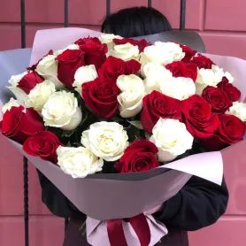 Этот букет из 51 эквадорской розы красно-бело-го цвета станет великолепным украшением любого праздника или выражением особых чувств. Каждый цветок тщательно подобран и свежий, что придает композиции особую яркость и элегантность Такой букет отлично подойдет для празднования свадьбы, юбилея или романтического признания. Цветовая гамма красных и белых роз символизирует страсть и чистоту чувств. Подарите этот роскошный букет, чтобы подчеркнуть свою искренность и тепло вашего отношения.
