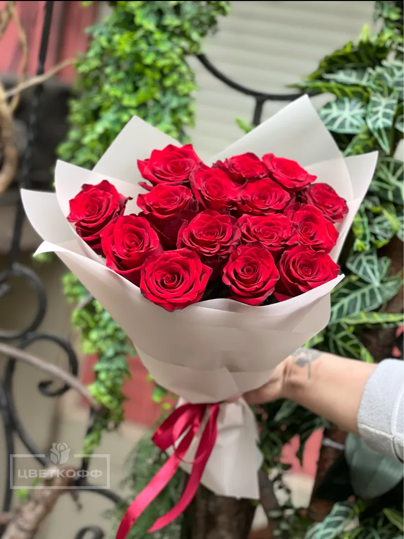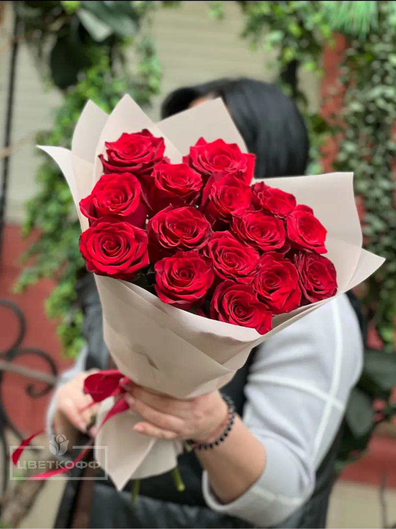 Букет из 15 красных роз в упаковке