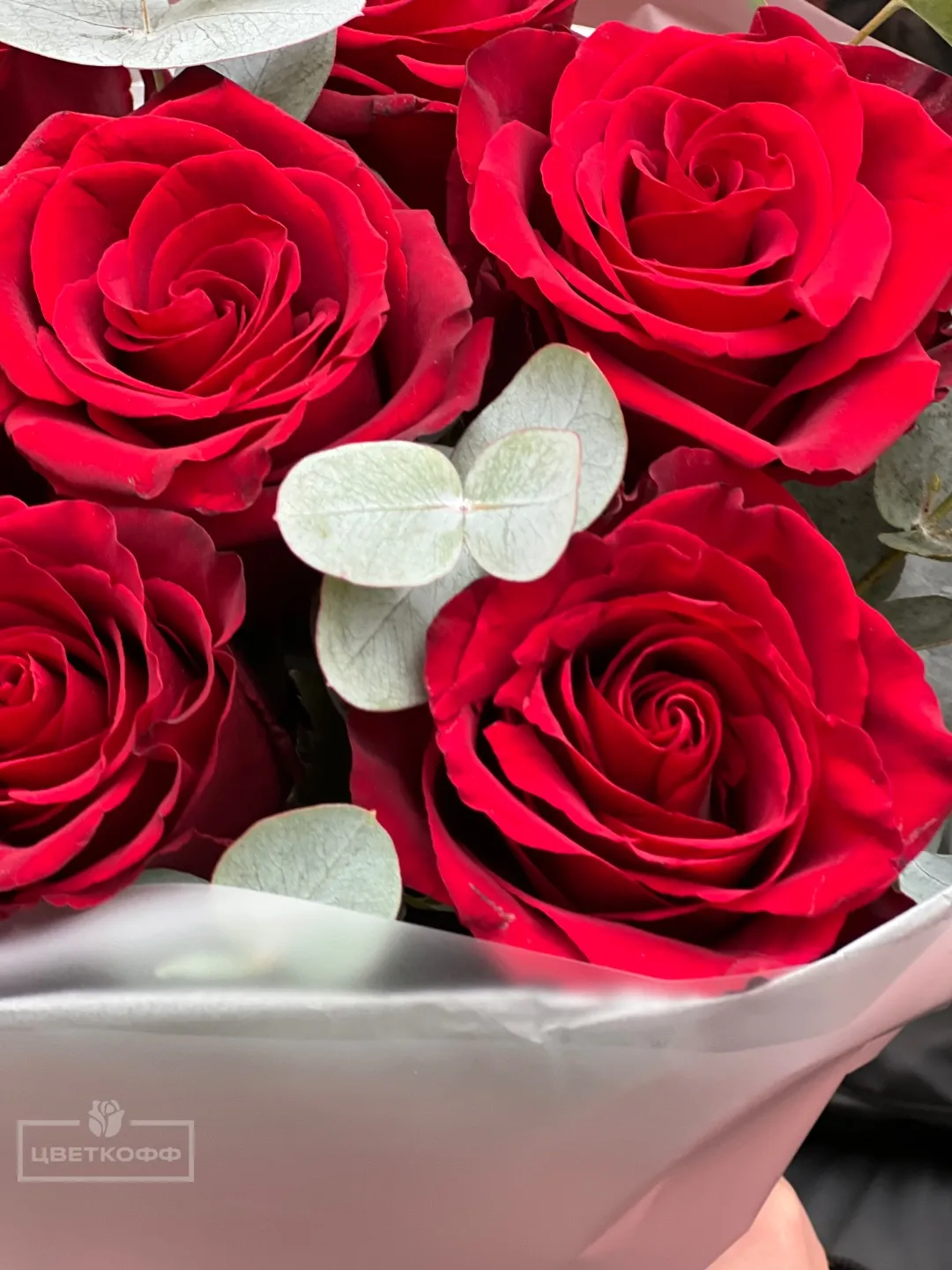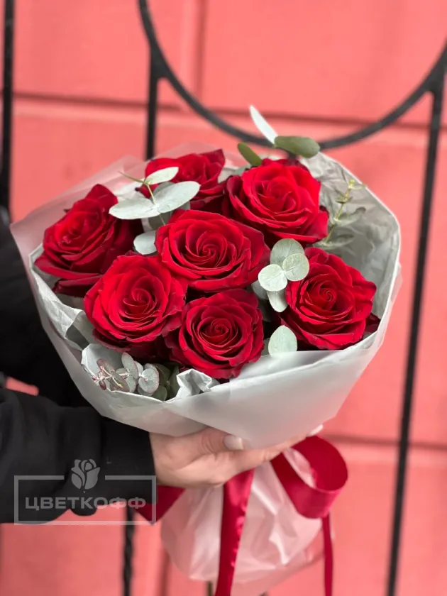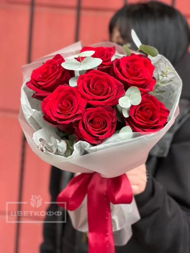 Букет из 7 красных роз с эвкалиптом