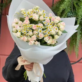 Монобукет с кустовой розой и ромашкой