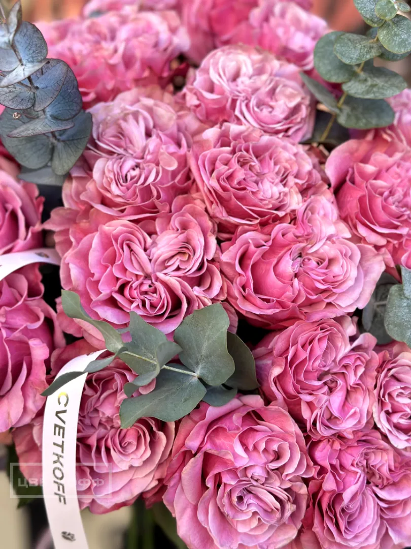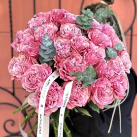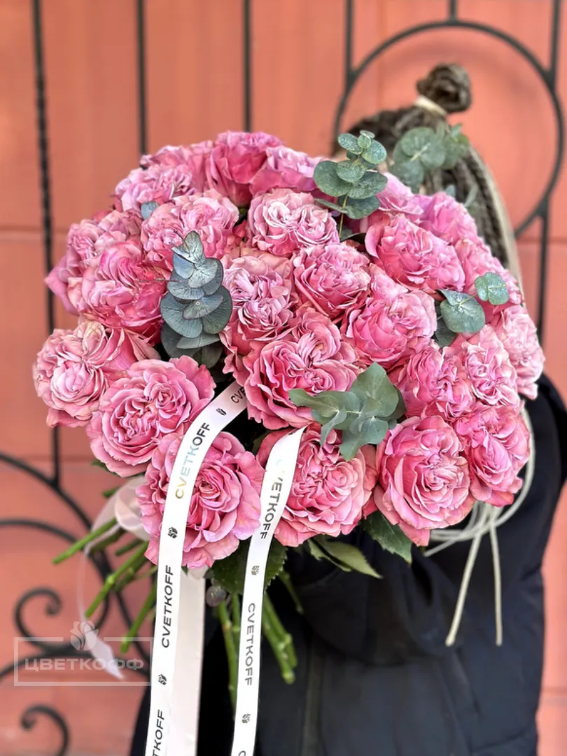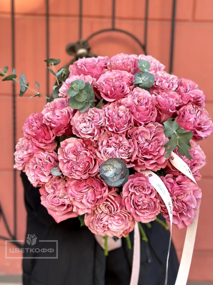 Моно букет из 25 пионовидных роз сорта «Квинс краун»
